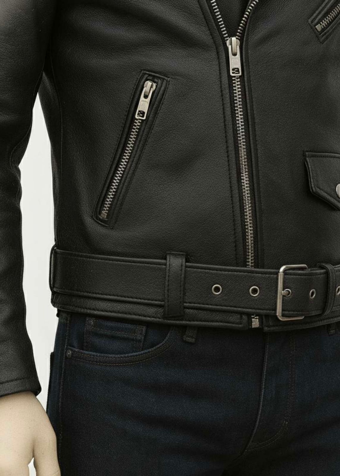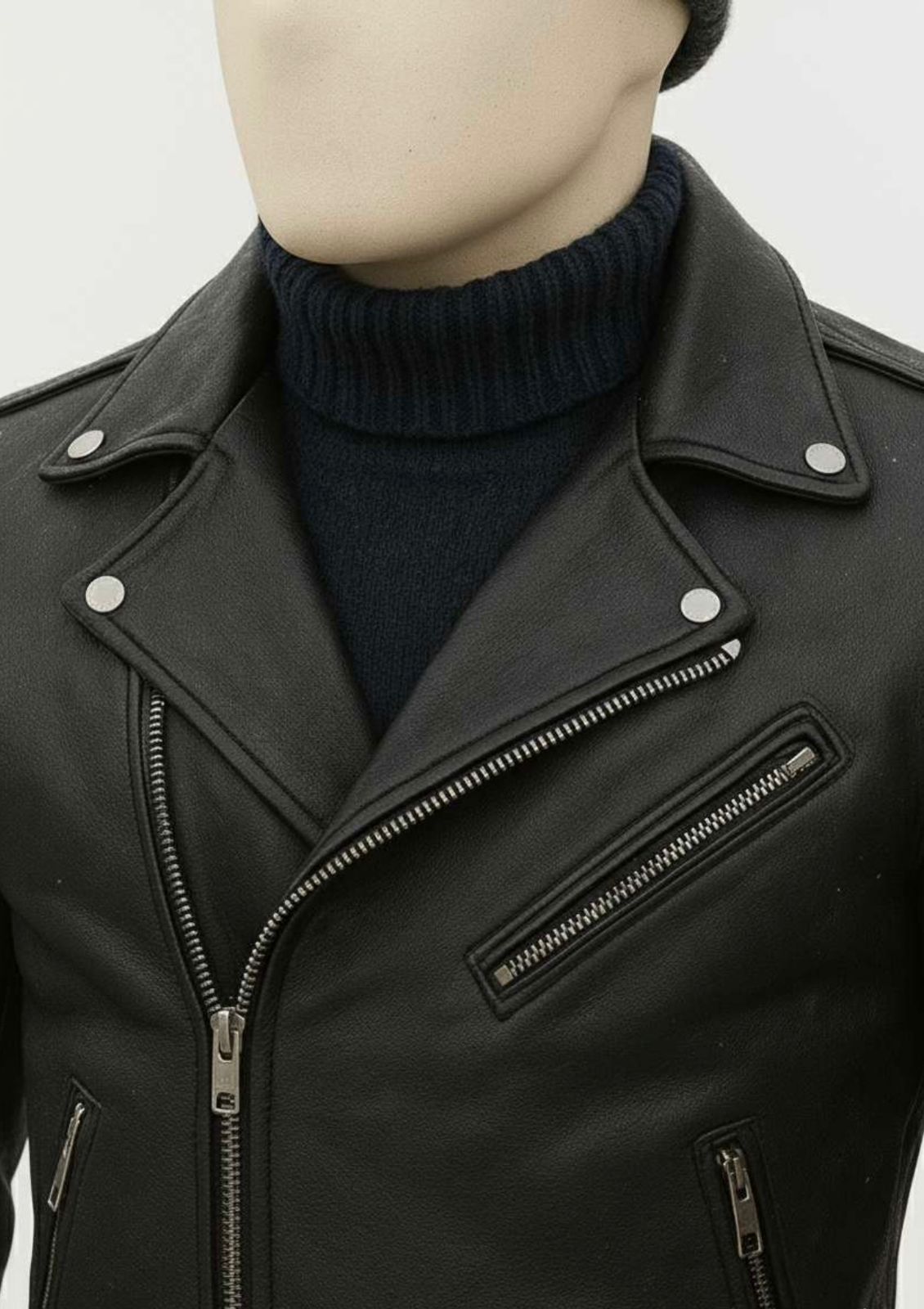 - Classic Notch Lapel: The wide collar is accented with silver studs, allowing you to wear it open or zipped high over a turtleneck (as shown in the image) for versatile styling.