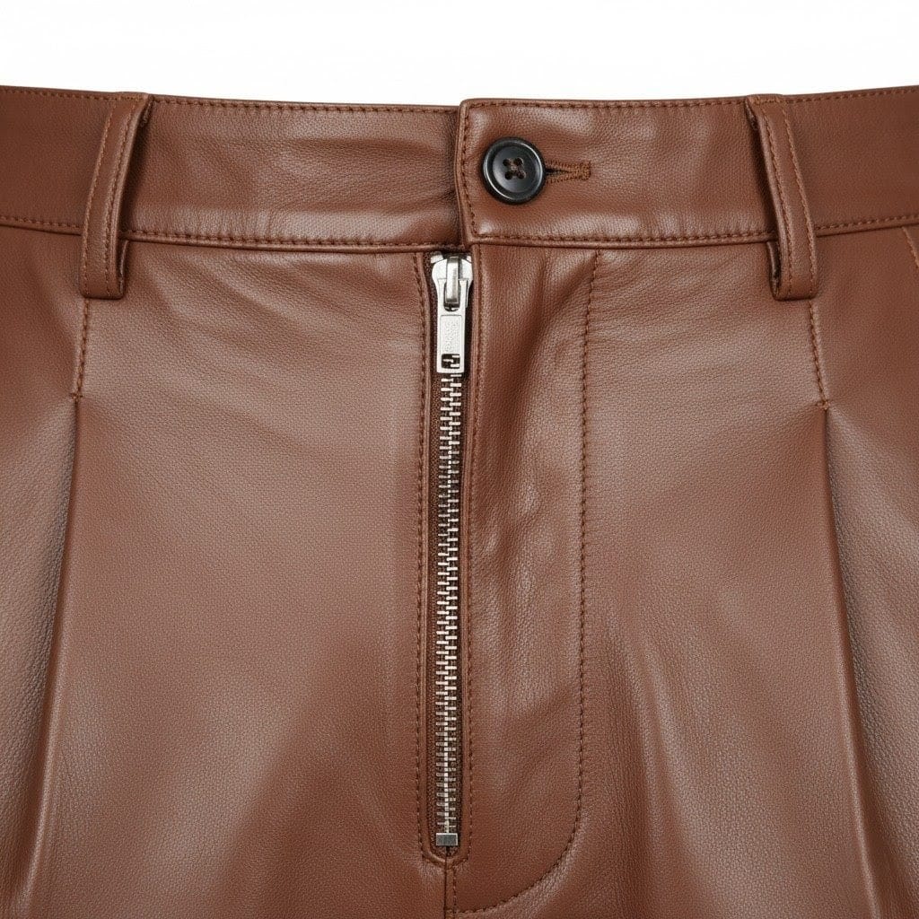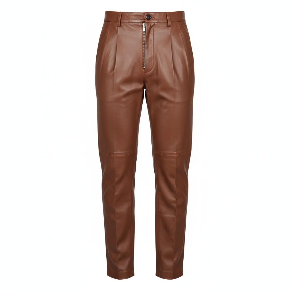Elevate your sartorial game with The Esquire Cognac Leather Trousers. These aren’t just pants; they’re a testament to distinguished style and luxurious taste for the modern man. Crafted from sumptuously soft Cognac Genuine Leather, they feature sharp pleats, a contemporary exposed zipper fly, and a flattering tapered fit. This piece artfully blends classic dress pant elements with the bold, tactile appeal of premium leather, offering an unparalleled look that transitions seamlessly from smart-casual events to elevated evening wear.