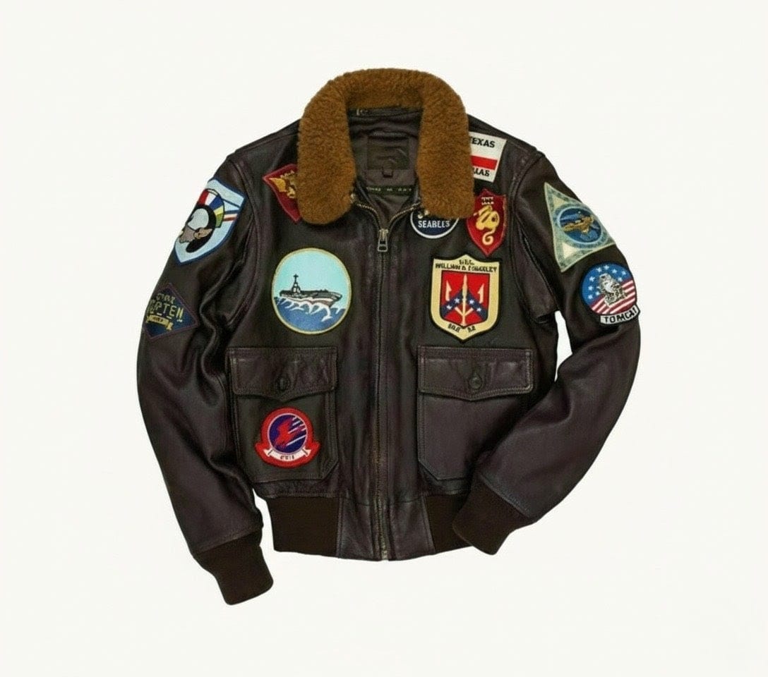 Command attention with The Maverick G-1 Bomber Jacket, a meticulous recreation of the legendary G-1 Naval Aviator flight coat made famous on the silver screen. This jacket is a celebration of heritage, bravery, and unparalleled style. Crafted from rich, dark brown genuine leather and adorned with an array of detailed patches, this piece is a collector’s dream and a guaranteed statement maker.