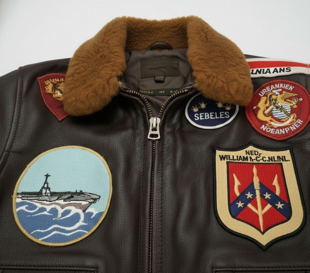 - Patchwork Detailing: Adorned with a curated collection of authentic-style, embroidered patches across the chest, sleeves, and back, referencing naval aviation squadrons and operations.